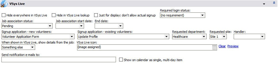 If checked, the open schedule job may be visible in VSys Live but can't be signed up for. You'd usually use this when asking people to call you or e-mail rather than sign up directly online. |