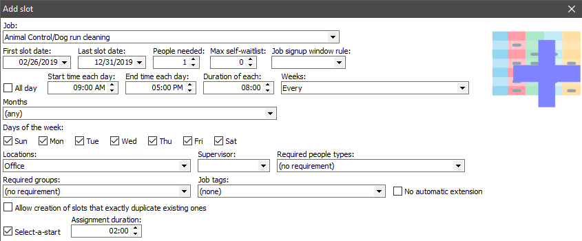 Select-a-start slots are used to allow volunteers to choose when during a day they'll perform a task. For example, at an animal shelter the dog run needs to be cleaned once sometime between 9am and 5pm, and this takes two hours. You don't care when during that eight hour time period they do this, but you do want to know when they'll be arriving and leaving.